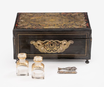 Joyero Bull en madera de ébano, carey e incrustaciones en metal con decoración vegetal, flores y rocallas. Bocallave en metal carey y nácar. Interior tapizado en terciopelo azul con diferentes compartimentos y 2 frascos en cristal dorado con decoración de flores. Época Napoleón III. Francia.