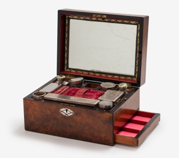 Neceser de viaje en madera de raíz de nogal con incrustaciones de nácar, interior con diferentes tarros en cristal con tapa en metal plateado, cajas, utensilios de manicura, espejo en la tapa superior, etc. A. Corhore 1863. Inglaterra.