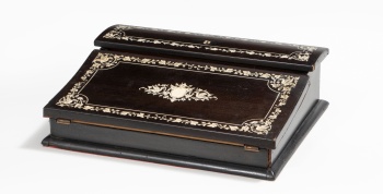 Escribanía en madera de palo santo y marquetería representando escudo central, aves y hojas, greca alrededor con hojas de parra, flores y aves. Interior en madera de erable con diferentes departamentos para tinteros y plumas con encimera en terciopelo. Época Victoriana.