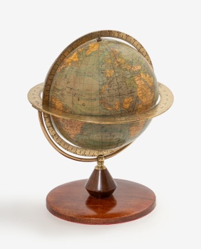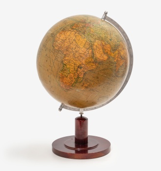 Globo terráqueo en papel, metal y base en madera de caoba.