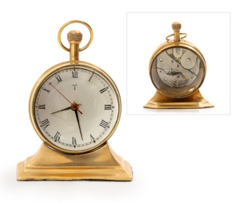 Reloj de sobremesa esqueleto y lupa en metal dorado, esfera blanca con números romanos. Cuerda.