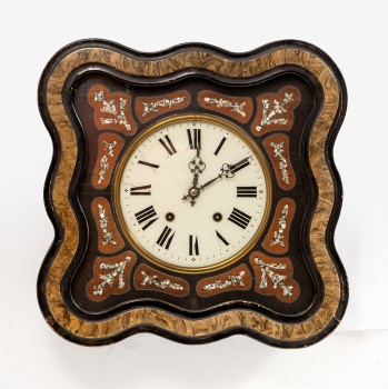 Reloj de pared en madera de caoba tallada con decoración vegetal e incrustaciones en metal y botones de nácar. Esfera blanca con números romanos. Sonería horas y medias. Estilo Luis XVI.