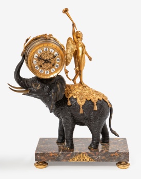 Reloj de sobremesa en bronce dorado y pavonado representando figura de elefante con ángel, racimos de uvas y hojas de parra. Base de mármol y remates en bronce condecoración vegetal. Esfera con números romanos y sonerías horas y medias. Estilo Luis XVI. Soher.