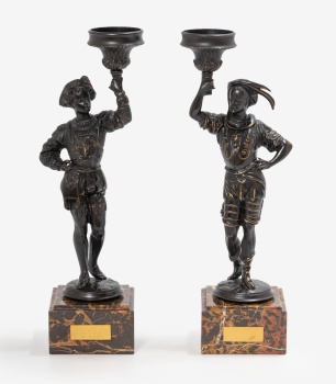 Pareja de hacheros en bronce pavonado representando sirvientes orientales. Base de mármol. Estilo Luis XVI. Soher.