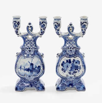 Pareja de candelabros de 2 brazos en porcelana esmaltada azul y blanca con decoración de medallones centrales y paisaje con río, barcos, casas, molinos, flores y hojas alrededor. Estilo Regencia. Sello en la base. Manufactura Delf. Holanda.
