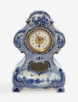 Reloj de sobremesa en porcelana esmaltada azul y blanca con medallón central representando paisaje con río, barcos y molinos, flores y rocallas alrededor. Esfera blanca con números árabes. Estilo Regencia. Sello en la base. Manufactura Delf. Holanda.