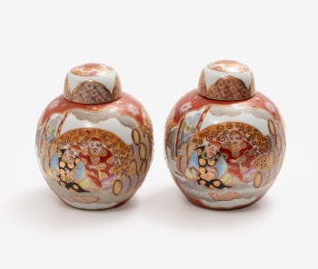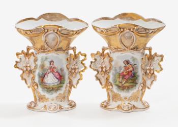 Pareja de jarrones en porcelana policromada y dorada con medallones centrales con decoración de caballero con mandolina y dama de corte, hojas de parra, bellotas y rocallas. Época Isabelina.