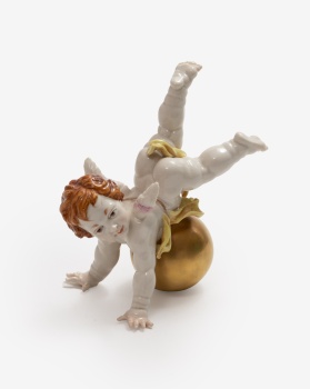 Figura en porcelana policromada y dorada representando ángel. Sello en la base. Manufactura Algora.