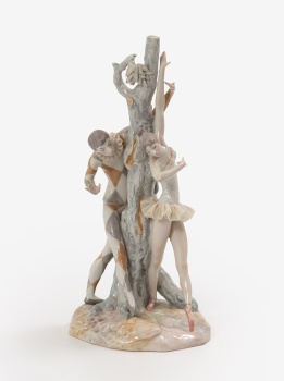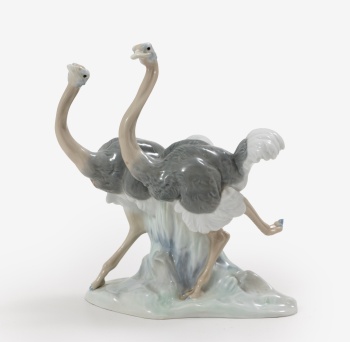 Figura en porcelana policromada representando pareja de avestruces. Sello en la base. Manufactura Lladró.