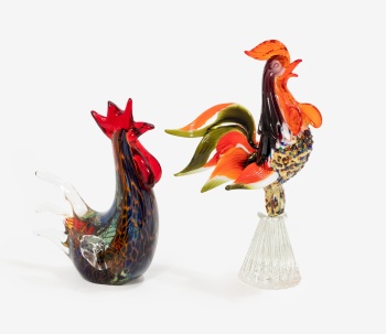Lote compuesto por 2 figuras en cristal de Murano en colores rojo, naranja, verde, etc. representando gallo y gallina.