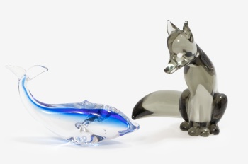 Lote compuesto por 2 figuras en cristal de Murano color ceniza y azul representando zorro y ballena.