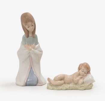 Lote compuesto por 2 figuras en porcelana policromada representando Virgen y Niño. Sello en la base. Manufactura Lladró.