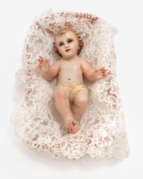 Época: S. XX Medidas: 9 x 16 x 28 cm. (Niño Jesús); 6,5 x 21 x 34 cm. (cuna) (Algún deterioro en los dedos)