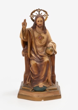 Figura en escayola policromada representando Sagrado Corazón de Jesús. Corona en metal y base en madera.