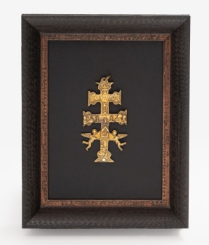 Cruz de Caravaca en metal dorado. Enmarcada.