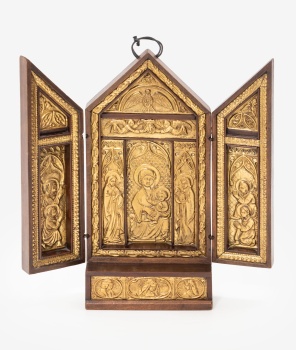 Tríptico en metal dorado representando Virgen con Niño, San José, San Juan, ángeles, con decoración de flores. Base en madera. Estilo Luis XVI.