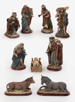 Época: S. XX Medidas: 21 x 10 x 8 cm. (San Jose); 18,5 x 10 x 9 cm. (Virgen); 5 x 12 x 8,5 cm. ; 19 x 11 x 7 cm. (ángel); 10 x 22 x 9 cm. (mula); 9 x 19 x 10 cm. (buey); 46 x 47 x 38 cm. (pesebre)