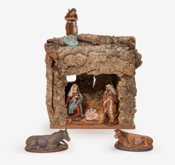 Nacimiento en terracota y tela pintada y pesebre en corcho con base en madera compuesto por: San Jose, Virgen María, niño Jesús, ángel, buey y mula.