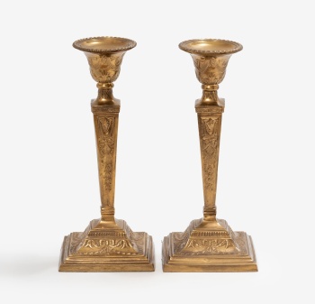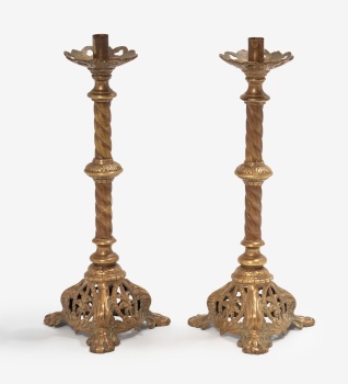 Pareja de candeleros en bronce dorado con decoración vegetal, rocallas, flores y rematando en patas de garras. Estilo Luis XVI. Época Neogótica.