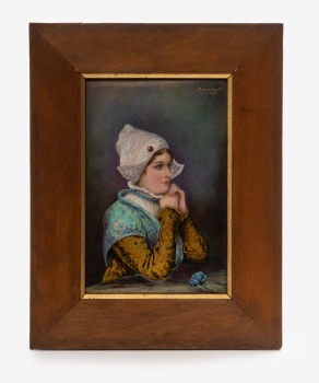 Esmalte sobre cobre representando joven con flor. Firmado Soustre. Limoges. Marco en madera.