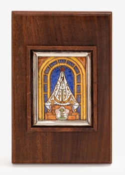Esmalte representando "Virgen de Begoña" con bisel en plata y marco en madera.