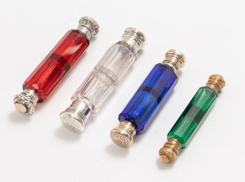 Conjunto de 4 esencieros en cristal de diferentes colores y tallado con tapones en plata dorada y metal plateado con decoración de flores, hojas y rocallas. Estilo Luis XVI.