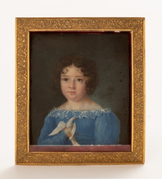 Miniatura pintada representando joven con paloma en la mano. Marco en bronce dorado con decoración vegetal. Estilo Luis XVI. Firmada