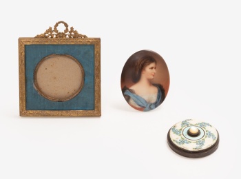 Lote compuesto por marco en bronce dorado con decoración vegetal y copete central con flores y corona, miniatura en porcelana pintada representando dama de corte y timbre antiguo en metal y esmalte con decoración de flores y botón central en madreperla. Estilo Luis XVI.