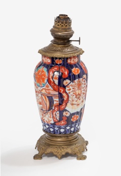 Quinque transformado a lámpara en latón con restos de dorado con decoración de corazones y perlas. Estilo Luis XVI.