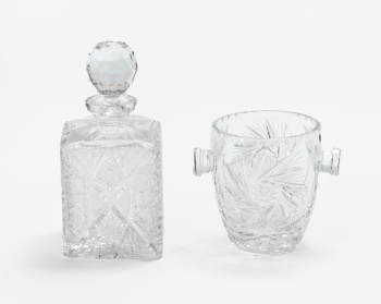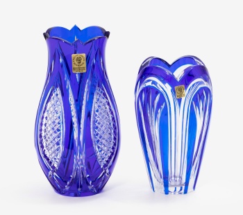 Lote compuesto por bombonera y jarrón en cristal de Bohemia tallado y grabado con decoración geométrica y jarrón en opalina con medallón central representando escena mitológica.