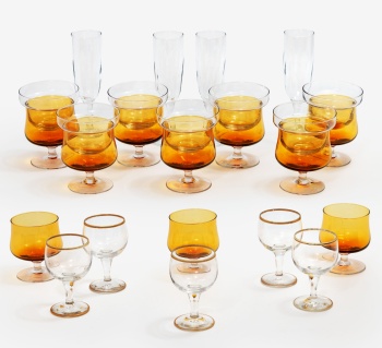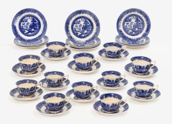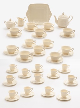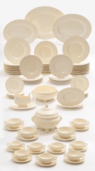 Vajilla en cerámica blanca y dorada compuesta por 61 piezas: 18 platos llanos, 12 platos hondos, 12 platos de postre, sopera, ensaladera, salsera, 2 almendreros, 3 fuentes ovales y fuente redonda. Sello en la base. Manufactura Royal China. Estilo Regencia.