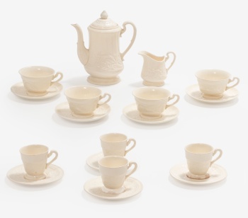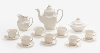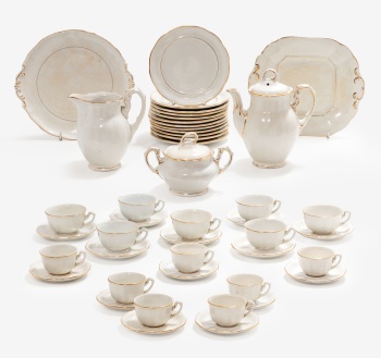 Juego de café en porcelana blanca, rosa y dorada con decoración de jarrones, flores hojas y rocallas., compuesto por 15 piezas: cafetera, tetera, lechera, 6 tazas y platos de café y 6 platos de merienda. Sello en la base. Manufactura Royal Doulton. Inglaterra. Estilo Regencia.