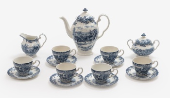 Juego de café en porcelana policromada y dorada compuesto por 14 piezas: cafetera, lechera, azucarero y 11 tazas y platos de café. Sello en la base. Manufactura Irabia. Pamplona.