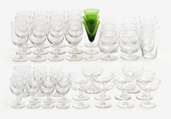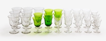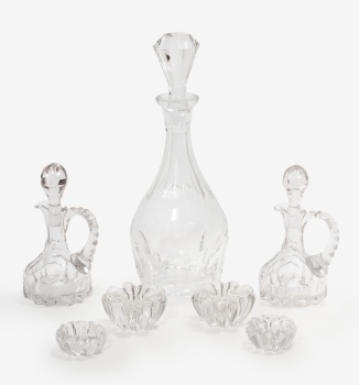 Lote compuesto por 6 piezas en cristal: 2 centros para tartas con decoración geométrica, 2 moldes de cocina con decoración de concha, centro en cristal y centro redondo en cristal tallado con decoración geométrica.