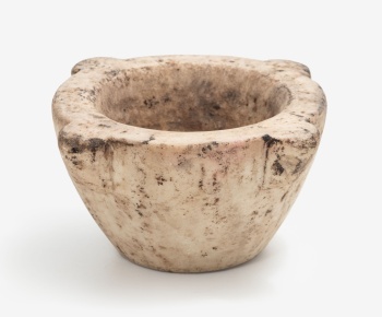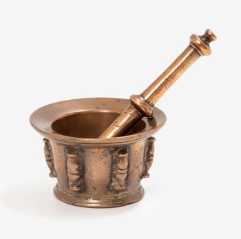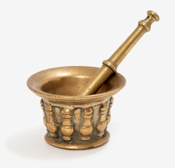 Época: S. XIX y S. XX Medidas: 7,5 x 11 x 11 cm. (almirez); 13 x 36 cm. (romana); 19 x 16,5 cm. (ornamento)
