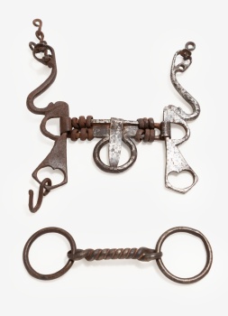 Lote compuesto por almirez en bronce con decoración de costillas, romana en hierro y ornamento oriental en hierro.